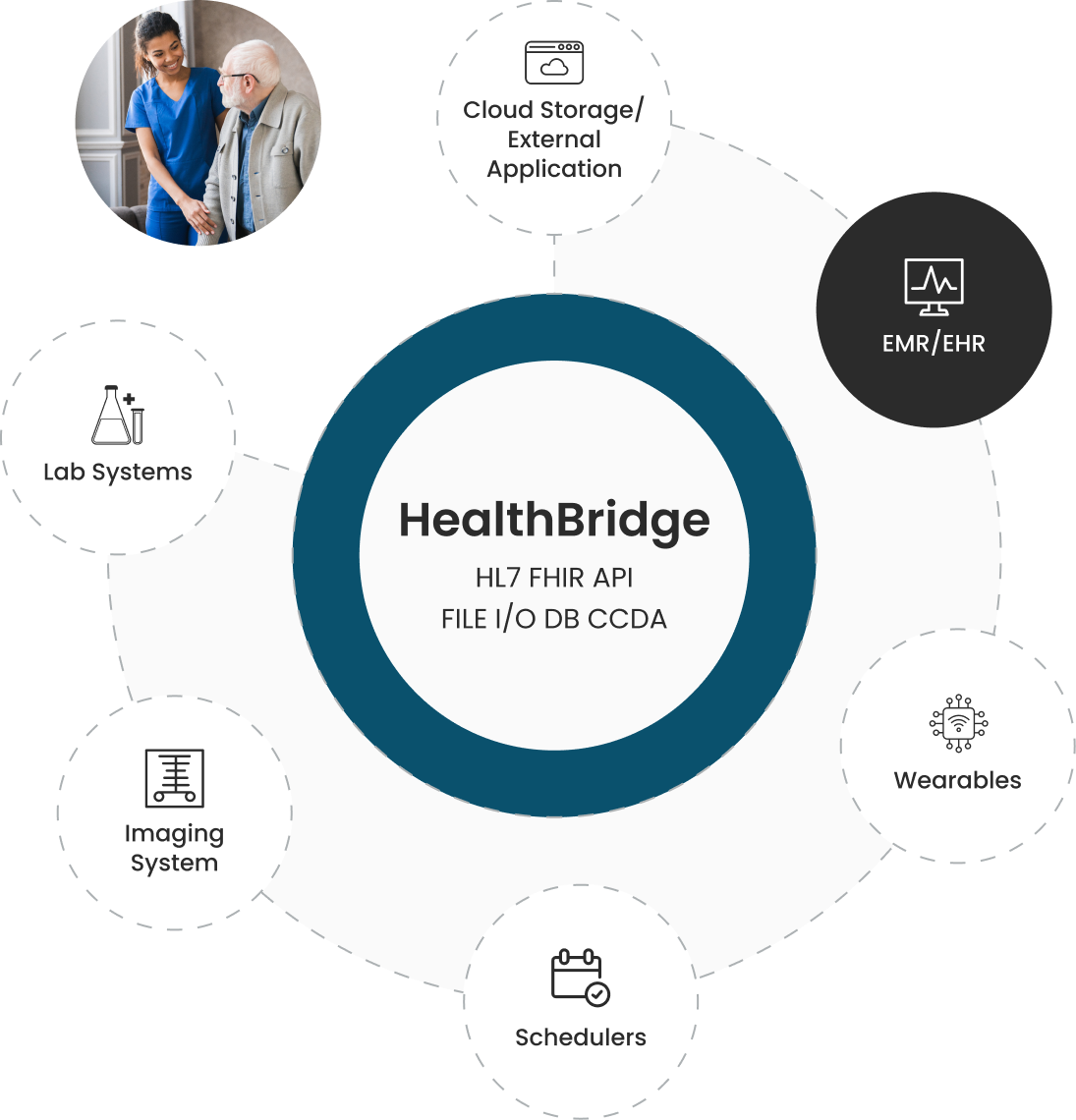 HealthBridge is our proprietary Interoperability Engine that solves the data liquidity problem across multiple health information systems like EHR/EMR, PMS, LIS, Wearables, Schedulers, etc.